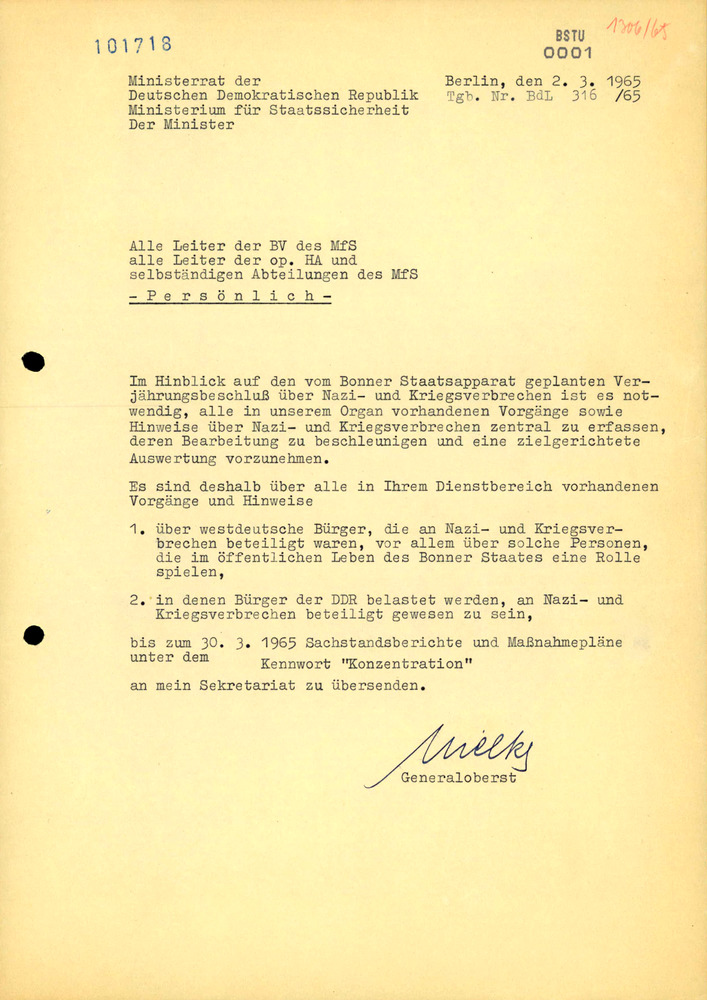 So lief u. a. im März 1965 eine durch Erich Mielke veranlasste Aktion zu NS-Verbrechen an. Mit Schreiben vom 02.03.1965 hatte er die Leiter der Stasi-Bezirksverwaltungen sowie die Leiter aller operativen Hauptabteilungen dazu aufgefordert, Unterlagen mit Informationen zu „Nazi- und Kriegsverbrechen“ zu erfassen und auszuwerten. Bis zum 30.03.1965 sollten diese in Form von Sachstandsberichten und Maßnahmeplänen an sein Sekretariat übersendet werden. Als Aktionsdecknamen wählte Mielke das unvermeidlich zynisch wirkende Kennwort „Konzentration“.