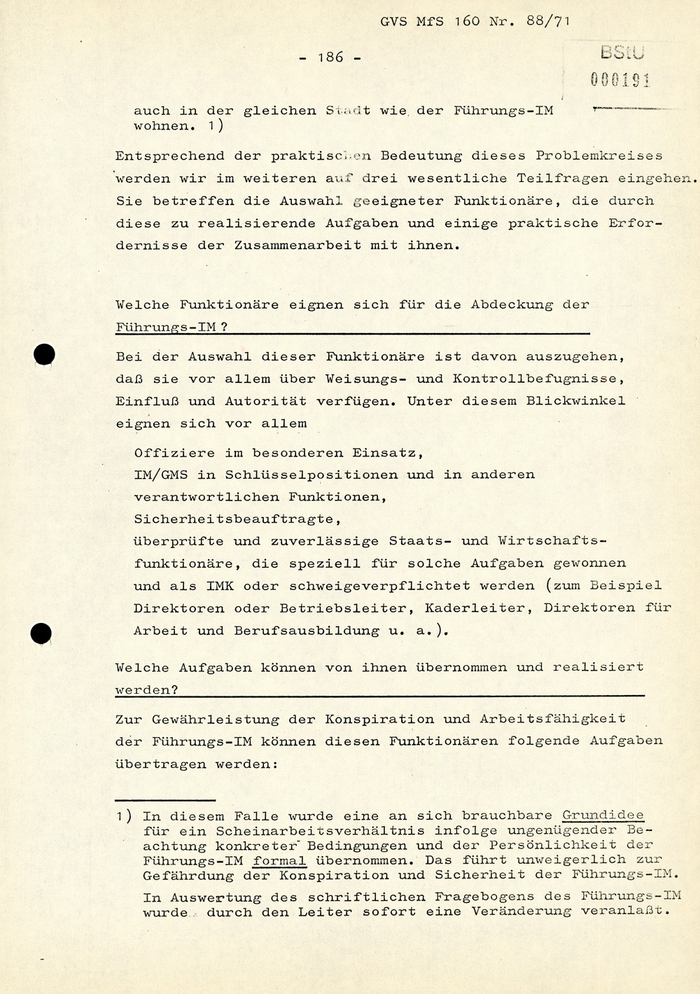 [Text der Fußnote Nr. 1] In diesem Falle wurde eine an sich brauchbare Grundidee für ein Scheinarbeitsverhältnis infolge ungenügender Beachtung konkreter-Bedingungen und der Persönlichkeit der Führungs-IM formal übernommen. Das führt unweigerlich zur Gefährdung der Konspiration und Sicherheit der Führungs-IM.