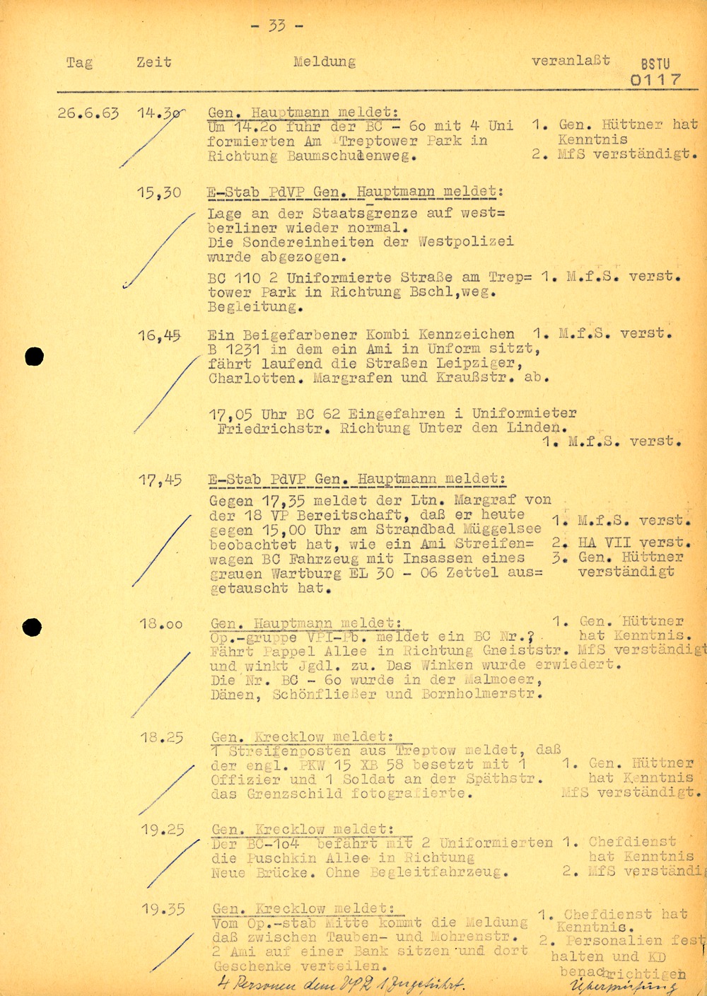 Bei dem vorliegenden Dokument handelt es sich um einen Ausschnitt aus einem Bericht zu "Sicherungsmaßnahmen Staatsgrenze Juni 1963" von MfS (Ministerium für Staatssicherheit) und Volkspolizei. Anlässlich des Besuchs von John F. Kennedy und seinem Konvoi, der entlang der Mauer fuhr, überwachten die Staatssicherheitsorgane der DDR insbesondere alle Vorfälle in Grenznähe. Beschattet wurden auch uniformierte Angehörige der Alliierten, die freien Zugang nach Ost-Berlin hatten.