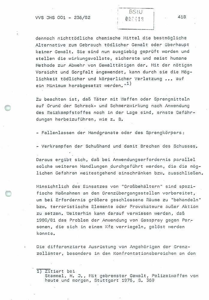Grenzübergangsstellen sowie von ausgewählten Kräften der Grenztruppen der DDR wird für zweckmäßig angesehen. Zu prüfen ist, ob Angehörige der Grenztruppen der-DDR an bestimmten Grenzabschnitten zumindest zeitweilig ebenfalls mit Handsprayflaschen ausgerüstet werden sollten (z.B. zur Abwehr beim Nahkampf, zum Zurückdrängen von Personen vom den Grenzsicherungsanlagen vorgelagerten Feld). Entsprechende Reizwurfkörper auf der Basis von CN bzw. CN/CS-Gemischen können auch zur wirksamen Abwehr von Angriffen auf Postentürme und Führungspunkte der Grenztruppen an der Staatsgrenze genutzt werden und sollten (ebenso wie TSM) zu deren ständiger militär-technischer Ausrüstung gehören.^1)^2)