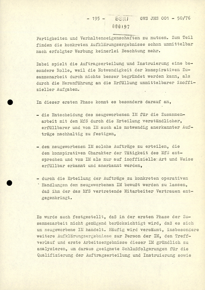 - die Entscheidung des neugeworbenen IM für die Zusammenarbeit mit dem MfS durch die Erteilung verständlicher, erfüllbarer und vom IM auch als notwendig anerkannter Aufträge nachhaltig zu festigen,
