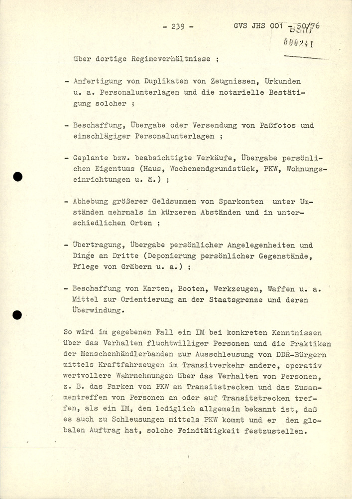 So wird im gegebenen Fall ein IM bei konkreten Kenntnissen über das Verhalten fluchtwilliger Personen und die Praktiken der Menschenhändlerbanden zur Ausschleusung von DDR-Bürgern mittels Kraftfahrzeugen im Transitverkehr andere, operativ wertvollere Wahrnehmungen über das Verhalten von Personen, z. B. das Parken von PKW an Transitstrecken und das Zusammentreffen von Personen an oder auf Transitstrecken treffen, als ein IM, dem lediglich allgemein bekannt ist, daß es auch zu Schleusungen mittels PKW kommt und er den globalen Auftrag hat, solche Feindtätigkeit festzustellen.