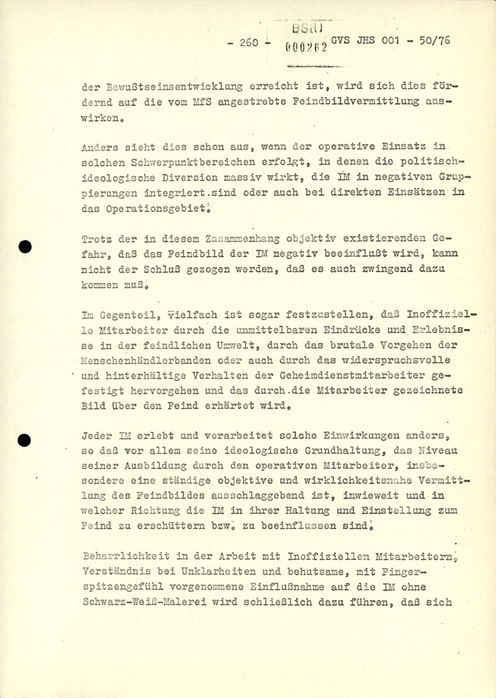Jeder IM erlebt und verarbeitet solche Einwirkungen anders, so daß vor allem seine ideologische Grundhaltung, das Niveau seiner Ausbildung durch den operativen Mitarbeiter, insbesondere eine ständige objektive und wirklichkeitsnahe Vermittlung des Feindbildes ausschlaggebend ist, inwieweit und in welcher Richtung die IM in ihrer Haltung und Einstellung zum Feind zu erschüttern bzw. zu beeinflussen sind.