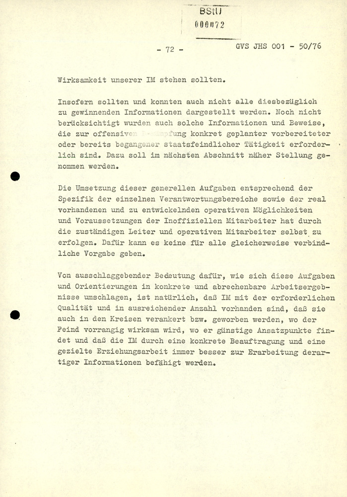 Ferner wurde bestimmt, dass "über Personen, die eine feindliche Tätigkeit ausüben, [...] Vorgänge" anzulegen sind und über "die erfassten Personen [...] eine zentrale Kartei" einzurichten ist. Das offensive Vorgehen gegen Regimegegner erfuhr eine Ergänzung in den gleichzeitig getroffenen Festlegungen zur Übergabe der als "feindlich" klassifizierten Personen an die Staatsanwaltschaften.