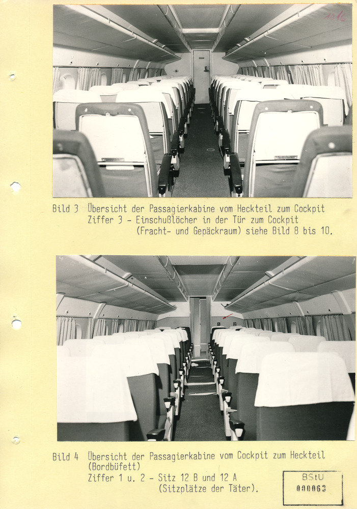 [Zu sehen ist auf dem aufgeklebten schwarz-weiß Positiv der Gang im Passagierraum aus vom Standpunkt Cockpit aus. Auf dem Boden am Gangende liegen Tüten und verschiedene Papiere verteilt sowie einige Kreidekreise. Die Sitzplätze des Ehepaars Wehage sind mit den Nummerntafeln 1 und 2 markiert. Ein manuell eingefügter pinker Pfeil zeigt auf das Einschussloch über dem linken Sitzplatz, dem Gangplatz.]