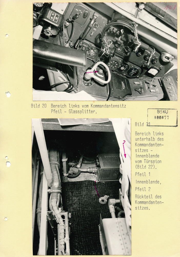[Das schwarz-weiße Positiv bildet den Bereich unter dem Sitz des Piloten ab. Unter dem Sitz verlaufen in der linken Bildseite Leitungen zu einem Strang fixiert und teilweise isoliert. Auf der rechten Bildseite ist im oberen Teil ein Gerät im Metalllochkäfig verbaut, dann folgt der Sitz. Vor dem angechlossenen Gerät liegt die abgebrochene Innenblende des Türspions der Cockpit-Tür. Sie wurde auf dem aufgeklebtem Bild mit einem manuell ergänzten pinken Pfeil und der Ziffer 1 markiert. Ein weiterer pinker Pfeil mit der Ziffer 2 zeigt auf das Rückteil des Kommandantensitzes.]