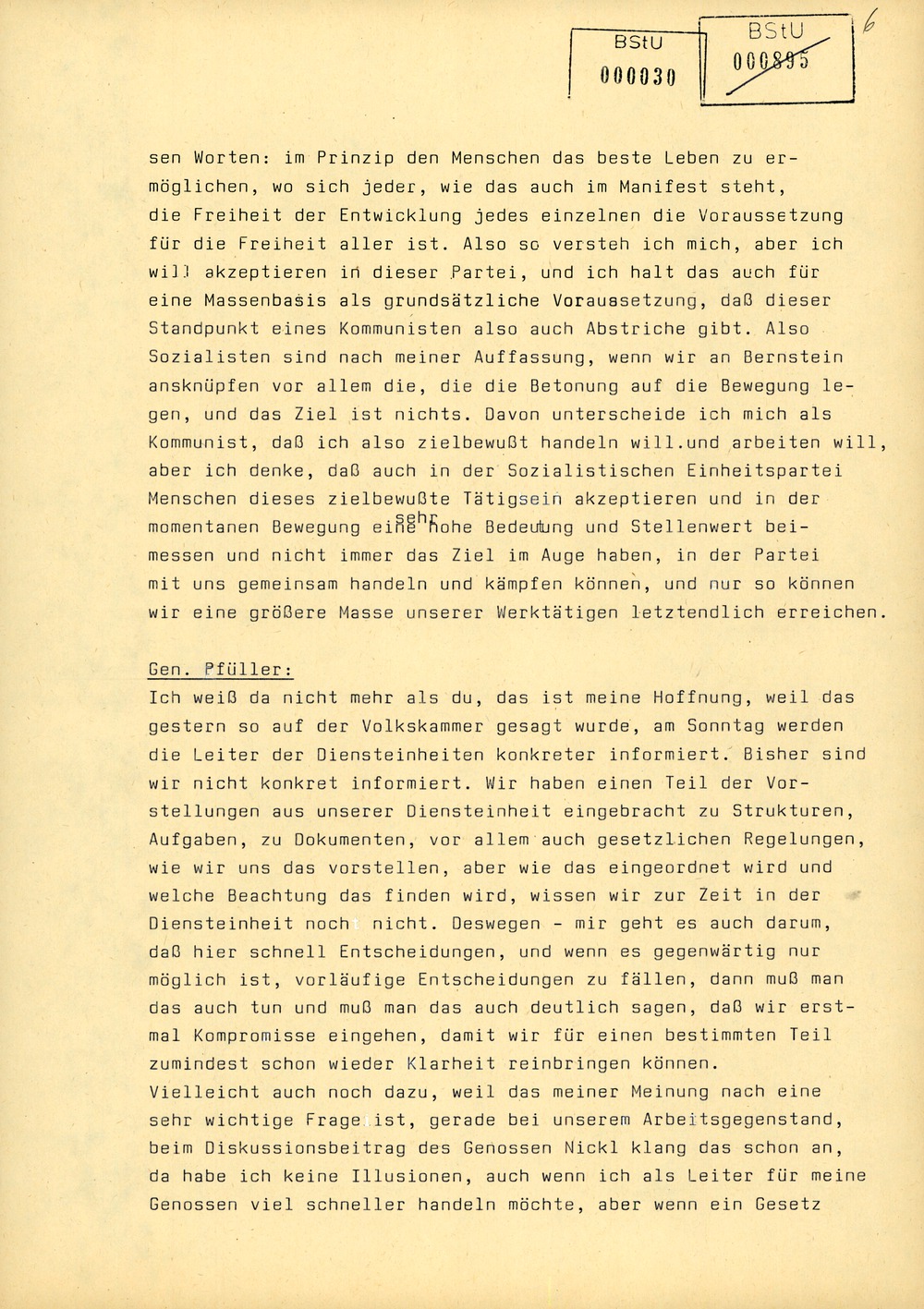 sen Worten: im Prinzip den Menschen das beste Leben zu ermöglichen, wo sich jeder, wie das auch im Manifest steht, die Freiheit der Entwicklung jedes einzelnen die Voraussetzung für die Freiheit aller ist. Also so versteh ich mich, aber ich will akzeptieren dieser Partei, und ich halt das auch für eine Massenbasis als grundsätzliche Voraussetzung, daß dieser Standpunkt eines Kommunisten also auch Abstriche gibt. Also Sozialisten sind nach meiner Auffassung, wenn wir an Bernstein ansknüpfen vor allem die, die die Betonung auf die Bewegung legen, und das Ziel ist nichts. Davon unterscheide ich mich als Kommunist, daß ich also zielbewußt handeln will und arbeiten will, aber ich denke, daß auch in der Sozialistischen Einheitspartei Menschen dieses zielbewußte Tätigsein akzeptieren und in der momentanen Bewegung eine sehr hohe Bedeutung und Stellenwert beimessen und nicht immer das Ziel im Auge haben, in der Partei mit uns gemeinsam handeln und kämpfen können, und nur so können wir eine größere Masse unserer Werktätigen letztendlich erreichen.