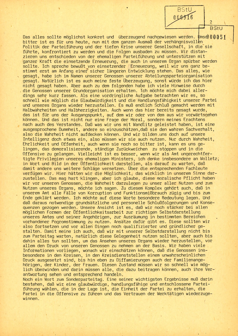 Das alles sollte möglichst konkret und überzeugend nachgewiesen werden. Umso bitter ist es für uns heute, nun mit dem ganzen Ausmaß der verhängnisvollen Politik der Parteiführung und der tiefen Krise unserer Gesellschaft, in die sie führte, konfrontiert zu werden und die Folgen ausbaden zu müssen. Wir distanzieren uns entschieden von der ehemaligen Parteiführung und unterstützen mit ganzer Kraft die einsetzende Erneuerung, die auch in unserem Organ spürbar werden sollte. Ich spreche bewußt von einsetzender Erneuerung, weil wir uns ganz bestimmt erst am Anfang einer sicher längeren Entwicklung stehen. Das alles, wie gesagt, habe ich im Namen unserer Genossen unserer Abteilungsparteiorganisation gesagt. Natürlich ist es auch meine feste Überzeugung, sonst würde ich das hier nicht gesagt haben. Aber auch zu dem folgenden habe ich viele Hinweise durch die Genossen unserer Grundorganisation erhalten. Ich möchte mich dabei allerdings sehr kurz fassen. Als eine vordringliche Aufgabe betrachten wir es, so schnell wie möglich die Glaubwürdigkeit und die Handlungsfähigkeit unserer Partei und unseres Organs wieder herzustellen. Es muß endlich Schluß gemacht werden mit Halbwährheiten und Halbherzigkeiten. Auch wenn das hier bereits gesagt wurde, das ist für uns der Ausgangspunkt, auf dem wir oder von dem aus wir vorwärtsgehen können. Und das ist nicht nur eine Frage der Moral, sondern meines Erachtens nach auch des Verstandes. Daß was wir uns mit Wandlitz geleistet haben, ist eine ausgesprochene Dummheit, andere so einzuschätzen, daß sie den wahren Sachverhalt, also die Wahrheit nicht aufdecken können. Und wir bilden uns doch auf unsere Intelligenz doch etwas ein, also müssen wir sie auch nutzen. Nur durch Wahrheit, Ehrlichkeit und Offenheit, auch wenn sie noch so bitter ist, kann es uns gelingen, das demoralisierende, ständige Zurückweichen zu stoppen und in die Offensive zu gelangen. Vielleicht ist es besser, wenn wir als Amt ungerechtfertigte Privilegien unseres ehemaligen Ministers, ich denke insbesondere an Wolletz; in Wort und Bild in der Öffentlichkeit darstellen, als darauf zu warten, daß damit andere uns weitere Schläge versetzen. Über die entsprechenden Fachleute verfügen wir. Hier hätten wir die Möglichkeit, das wirklich in unserem Sinne darzustellen. Das mag hart klingen, aber ich glaube, diese moralische Pflicht haben wir vor unseren Genossen, die Wahrheit darzulegen zu unser aller Nutzen und zum Nutzen unseres Organs, möchte ich sagen. Zu diesem Komplex gehört auch, daß in unserem Amt alle Fälle von Korruption und Funktionsmißbrauch zügig und bis zum Ende geklärt werden. Ich möchte auf diese Worte besondere Bedeutung legen. Und daß daraus notwendige grundsätzliche und personelle Schlußfolgerungen und Konsequenzen gezogen werden. Unsere Ansicht ist es, daß wir noch stärker bei allen möglichen Formen der Öffentlichkeitsarbeit zur richtigen Selbstdarstellung unseres Amtes und seiner Angehörigen, zur Ausräumung in bestimmten Bereichen vorhandener Pogromstimmung zu nutzen. Ansätze dafür gibt es. Diese sollten wir also fortsetzen und vor allen Dingen noch qualifizierter und gründlicher gestalten. Damit meine ich auch, daß wir mit unserer Selbstdarstellung nicht bis zum Parteitag warten, natürlich diese Gelegenheit nutzen sollten, aber auch bis dahin alles tun sollten, um das Ansehen unseres Organs wieder herzustellen, vor allem den Druck von unseren Genossen zu nehmen an der Basis. Wir haben viele Informationen vorliegen, wonach wir einschätzen können, daß die Genossen insbesondere in den Kreisen, in den Kreisdienststellen einem unwahrscheinlichen Druck ausgesetzt sind, bis hin eben zu Diffamierungen auch der Familienangehörigen, der Kinder, der Frauen. Diesen Zustand müssen wir so schnell wie möglich überwinden und darin müssen alle, die dazu beitragen können, auch ihre Verantwortung sehen und entsprechend handeln.
