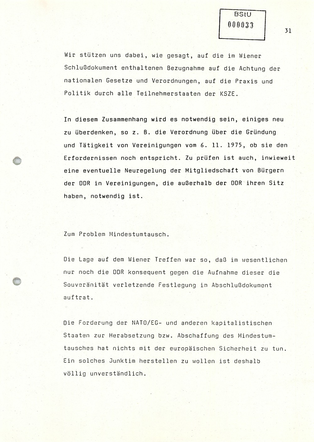 Die Forderung der NATO/EG- und anderen kapitalistischen Staaten zur Herabsetzung bzw. Abschaffung des Mindestumtausches hat nichts mit der europäischen Sicherheit zu tun. Ein solches Junktim herstellen zu wollen ist deshalb völlig unverständlich.