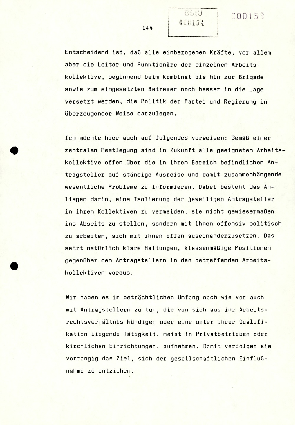 Ich möchte hier auch auf folgendes verweisen: Gemäß einer zentralen Festlegung sind in Zukunft alle geeigneten Arbeitskollektive offen über die in ihrem Bereich befindlichen Antragsteller auf ständige Ausreise und damit zusammenhängende wesentliche Probleme zu informieren. Dabei besteht das Anliegen darin, eine Isolierung der jeweiligen Antragsteller in ihren Kollektiven zu vermeiden, sie nicht gewissermaßen ins Abseits zu stellen, sondern mit ihnen offensiv politisch zu arbeiten, sich mit ihnen offen auseinanderzusetzen. Das setzt natürlich klare Haltungen, klassenmäßige Positionen gegenüber den Antragstellern in den betreffenden Arbeitskollektiven voraus.
