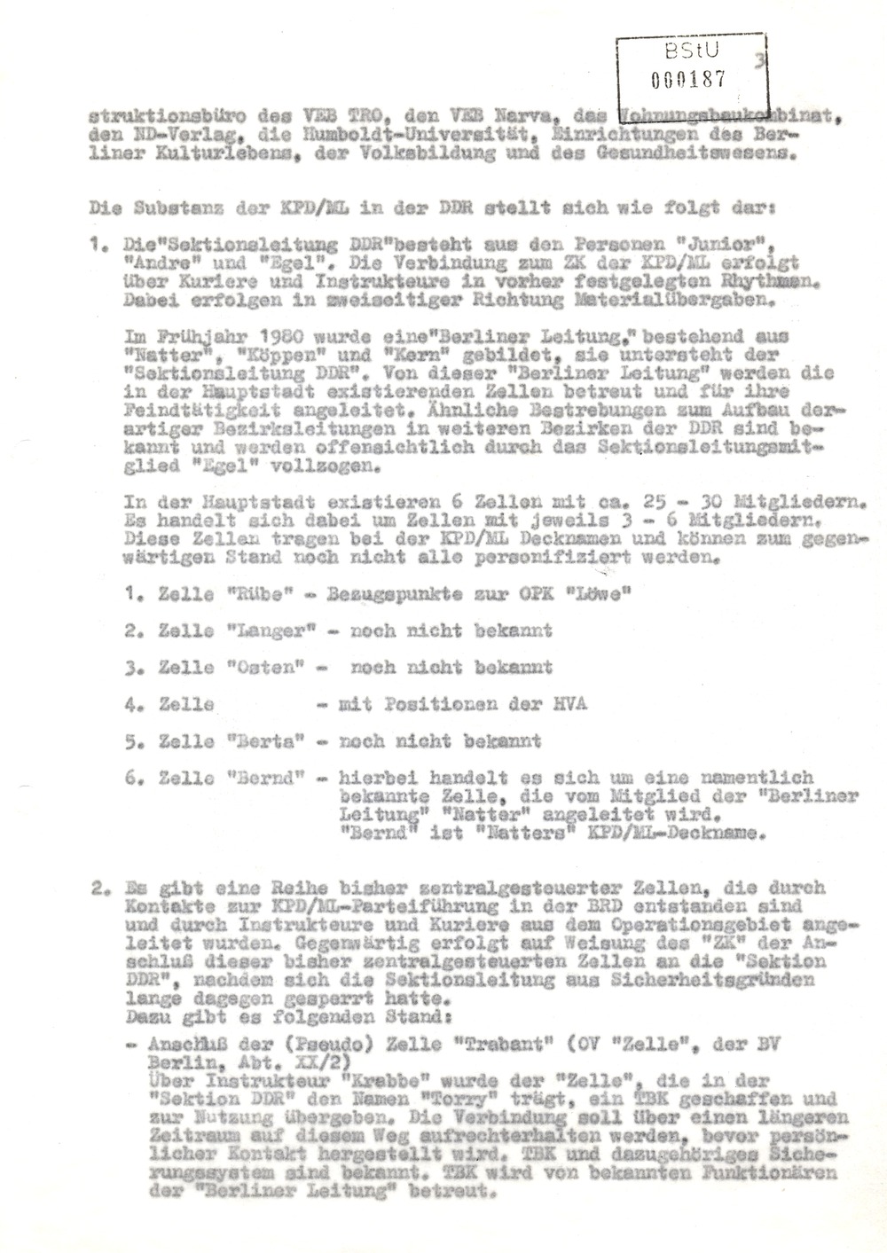 2. Es gibt eine Reihe bisher zentralgesteuerter Zellen, die durch Kontakte zur KPD/ML-Parteiführung in der BRD entstanden sind und durch Instrukteure und Kuriere aus dem Operationsgebiet angeleitet wurden. Gegenwärtig erfolgt auf Weisung des "ZK" der Anschluß dieser bisher zentralgesteuerten Zellen an die "Sektion DDR", nachdem sich die Sektionsleitung aus Sicherheitsgründen lange dagegen gesperrt hatte.