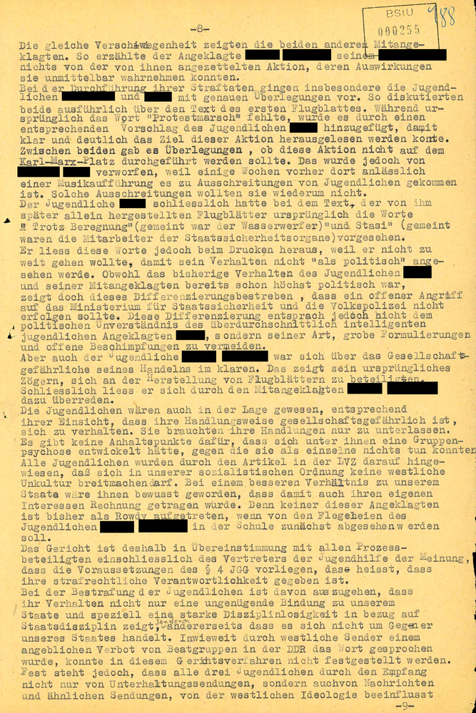 Bei der Bestrafung der Jugendlichen ist davon aus zugehen, dass ihr Verhalten nicht nur eine ungenügende Bindung zu unserem Staate und speziell eine starke Disziplinlosigkeit in bezug auf Staatsdisziplin zeigt, [handschriftliche Ergänzung: sondern] andererseits dass es sich nicht um Gegner unseres Staates handelt. Inwieweit durch westliche Sender einem angeblichen Verbot von Beatgruppen in der DDR das Wort gesprochen wurde, konnte in diesem Gerichtsverfahren nicht festgestellt werden. Fest steht jedoch, dass alle drei Jugendlichen durch den Empfang nicht nur von Unterhaltungssendungen, sondern auchvon Nachrichten und ähnlichen Sendungen, von der westlichen Ideologie beeinflusst