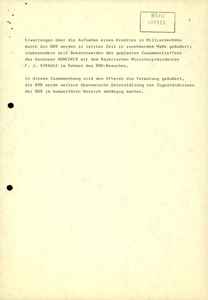 Erwartungen über die Aufnahme eines Kredites in Milliardenhöhe durch die DDR werden in letzter Zeit in zunehmendem Maße geäußert; insbesondere seit Bekanntwerden des geplanten Zusammentreffens des Genossen Honecker mit dem Bayerischen Ministerpräsidenten F. J. Strausz im Rahmen des BRD-Besuches.