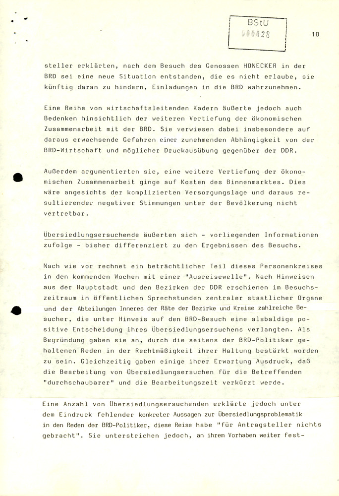 Eine Reihe von wirtschaftsleitenden Kadern äußerte jedoch auch Bedenken hinsichtlich der weiteren Vertiefung der ökonomischen Zusammenarbeit mit der BRD. Sie verwiesen dabei insbesondere auf daraus erwachsende Gefahren einer zunehmenden Abhängigkeit von der BRD-Wirtschaft und möglicher Druckausübung gegenüber der DDR.